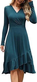 Beluring Wrap Dress Women's Elegant Long Sleeve Midi Dress V-Neck Plain Ruffle Hem Tunic Dresses