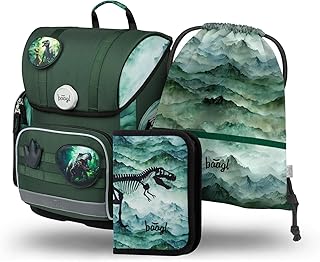 Baagl School Bag Boys Set of 3 Ergo School Bag for 1st Grade, Ergonomic Primary School Satchel with Chest Strap, dino, School bag set