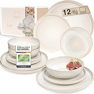 SÄNGER Corfu Crockery Set 12 Pieces for 4 People, Stoneware Crockery Handmade Test Very Good, Plate Set, Dining & Dessert Plates, Deep Plate Set, Cream with Sandy Grain | Premium Collection