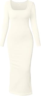 OQQ Women's Long Sleeve Square Neck Fit Seamless Ribbed Design Casual Loungewear Maxi Dress Bodycon