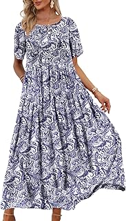 YESNO EJFDE Women's Casual Loose Summer Dress, Long Boho Round Neck Maxi Dress, Beach Dress, Flower Dress