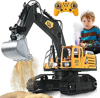 FUYLEY Remote Controlled Excavator Toy for Boys, 14 Channel 2.4 GHz RC Excavator Metal Shovel with Spray Light Sound, RC Construction Toy 680° Rotation for Boys Gift