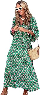MessBebe Summer Dresses Women's Elegant Boho Long Sleeve Floral Dress V-Neck Maxi Dress Casual Summer Casual Dress