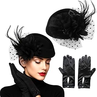 Vintage Fascinator Hat Women with Lace Gloves - 50s Retro Style Black Feather Tea Party Hat with Mesh Veil & 1 Pair Black Lace Gloves Accessories for Cocktail Party Wedding
